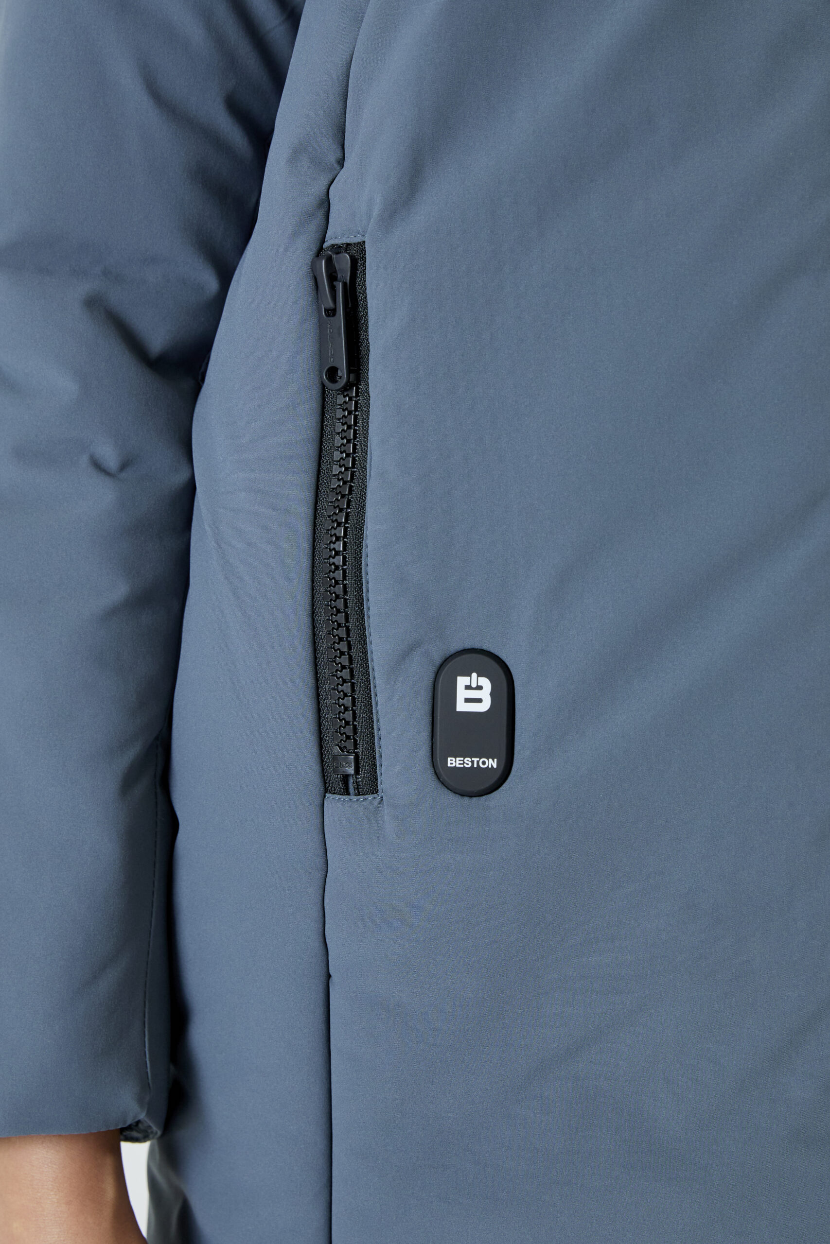 Heat-In Technology 2.0 coat: 9 adjustable temperature options, 5 optimized heating zones, with mobile charging functionality and up to 6 and a half hours of duration (battery included in delivery). Integrated personalized QR: Includes your professional, social and emergency profile. Made with certified recycled materials.