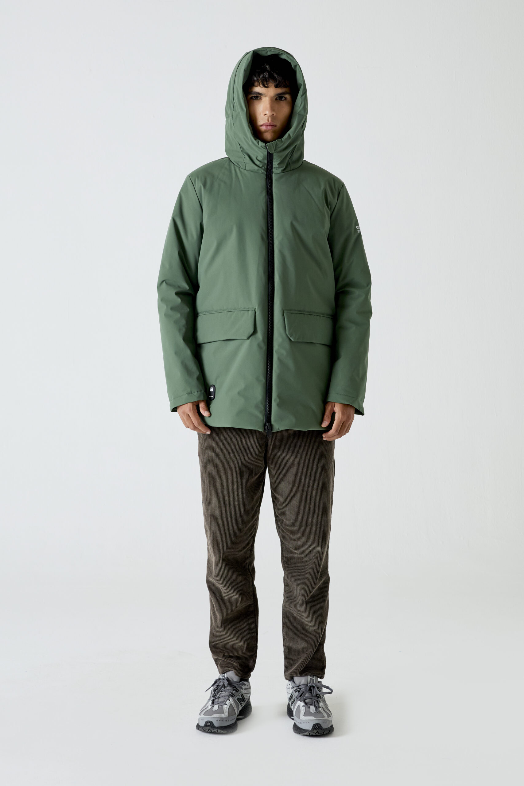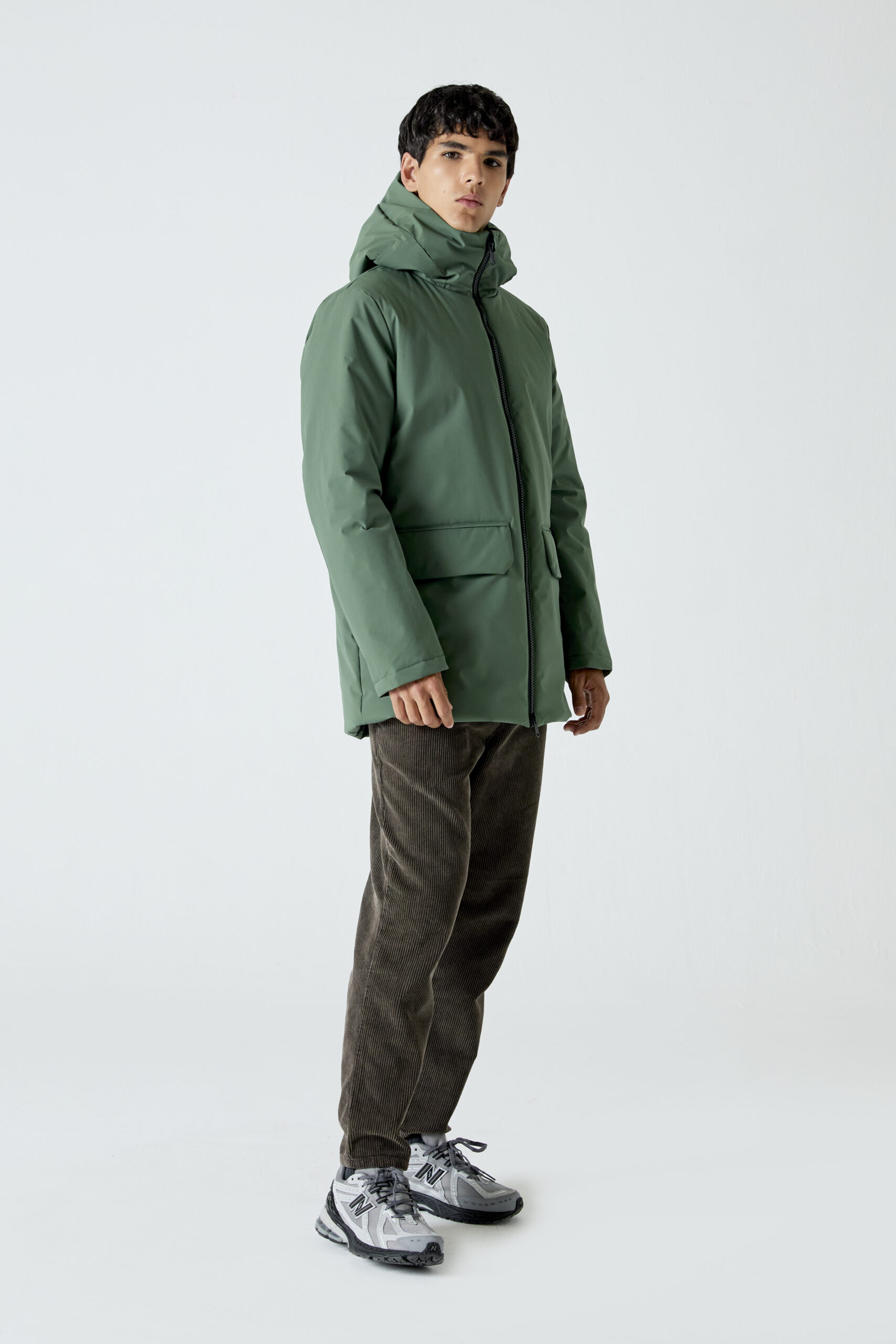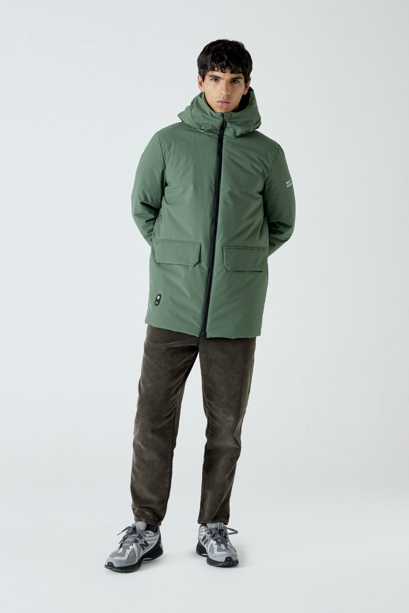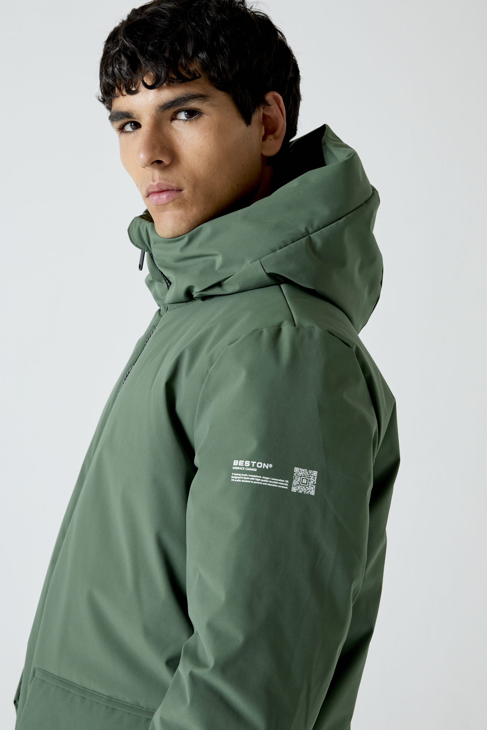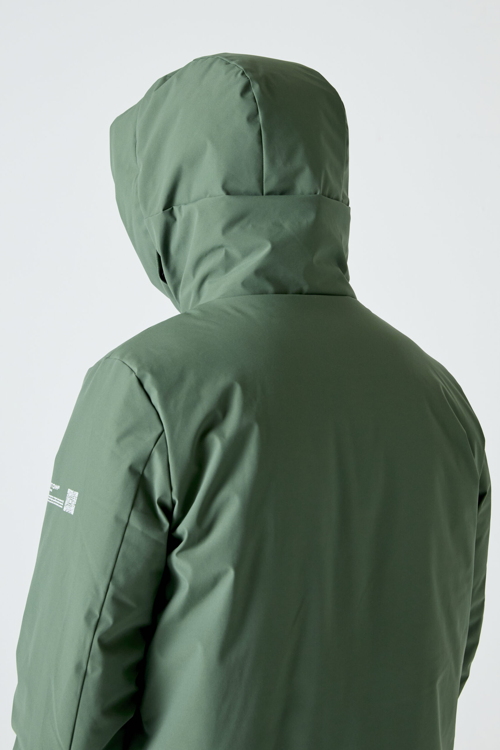Heat-In Technology 2.0 coat: 9 adjustable temperature options, 5 optimized heating zones, with mobile charging functionality and up to 6 and a half hours of duration (battery included in delivery). Integrated personalized QR: Includes your professional, social and emergency profile. Made with certified recycled materials.
