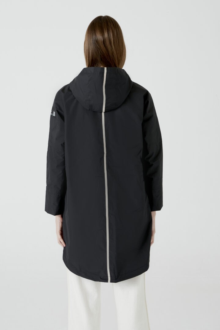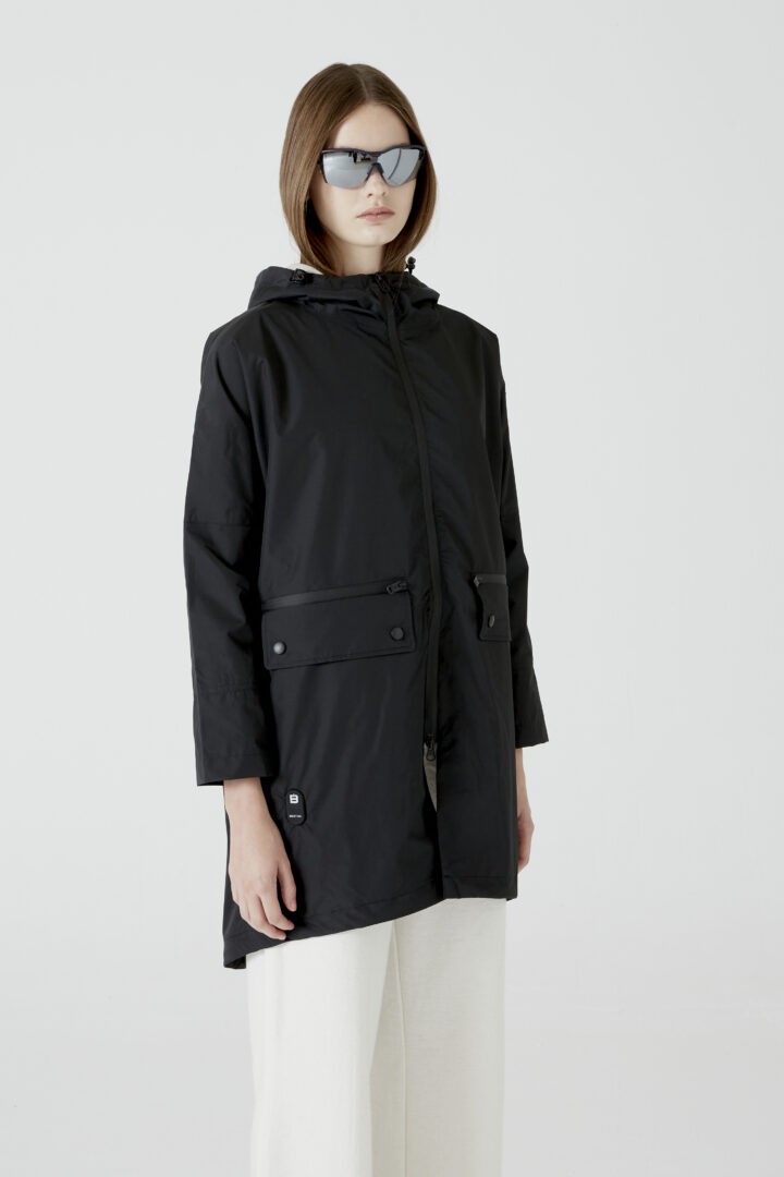 Heat-In Technology 2.0 raincoat: 9 adjustable temperature options, 5 optimized heating zones, with mobile charging functionality and up to 6 and a half hours of duration (battery included in delivery). Integrated personalized QR: Includes your professional, social and emergency profile. Made with certified recycled materials.
