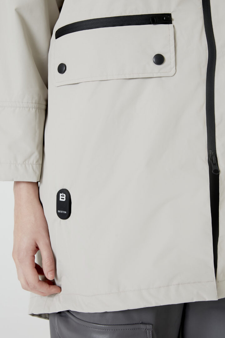 Heat-In Technology 2.0 raincoat: 9 adjustable temperature options, 5 optimized heating zones, with mobile charging functionality and up to 6 and a half hours of duration (battery included in delivery). Integrated personalized QR: Includes your professional, social and emergency profile. Made with certified recycled materials.