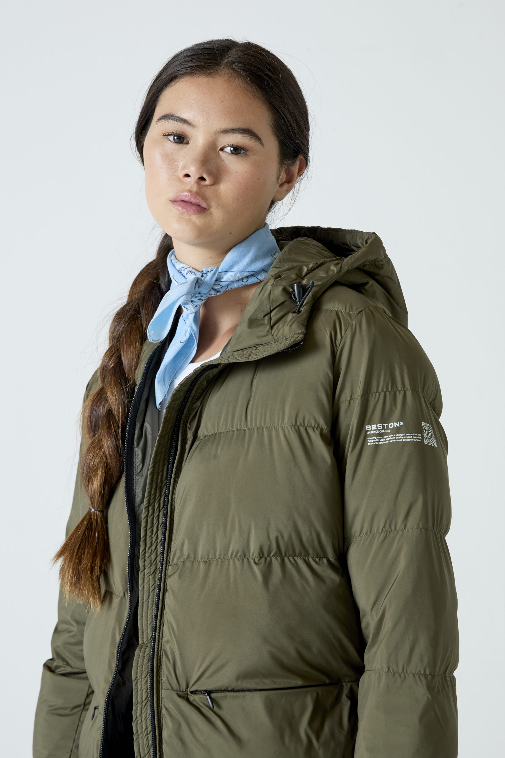 Heat-In Technology 2.0 coat: 9 adjustable temperature options, 5 optimized heating zones, with mobile charging functionality and up to 6 and a half hours of duration (battery included in delivery). Integrated personalized QR: Includes your professional, social and emergency profile. Made with certified recycled materials.