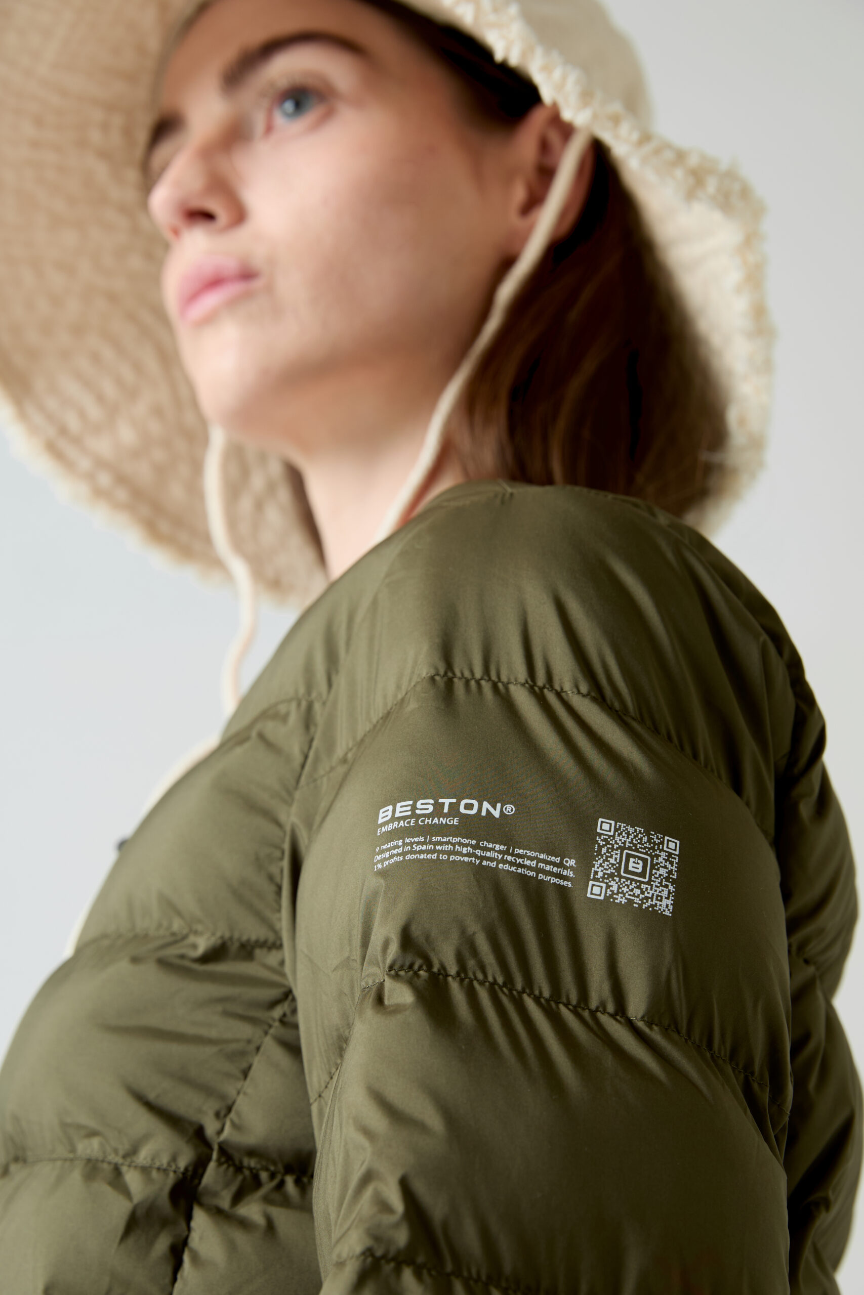 Heat-In Technology 2.0 coat: 9 adjustable temperature options, 5 optimized heating zones, with mobile charging functionality and up to 6 and a half hours of duration (battery included in delivery). Integrated personalized QR: Includes your professional, social and emergency profile. Made with certified recycled materials.