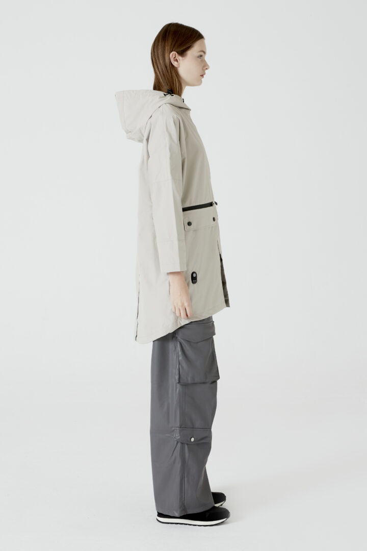 Heat-In Technology 2.0 raincoat: 9 adjustable temperature options, 5 optimized heating zones, with mobile charging functionality and up to 6 and a half hours of duration (battery included in delivery). Integrated personalized QR: Includes your professional, social and emergency profile. Made with certified recycled materials.