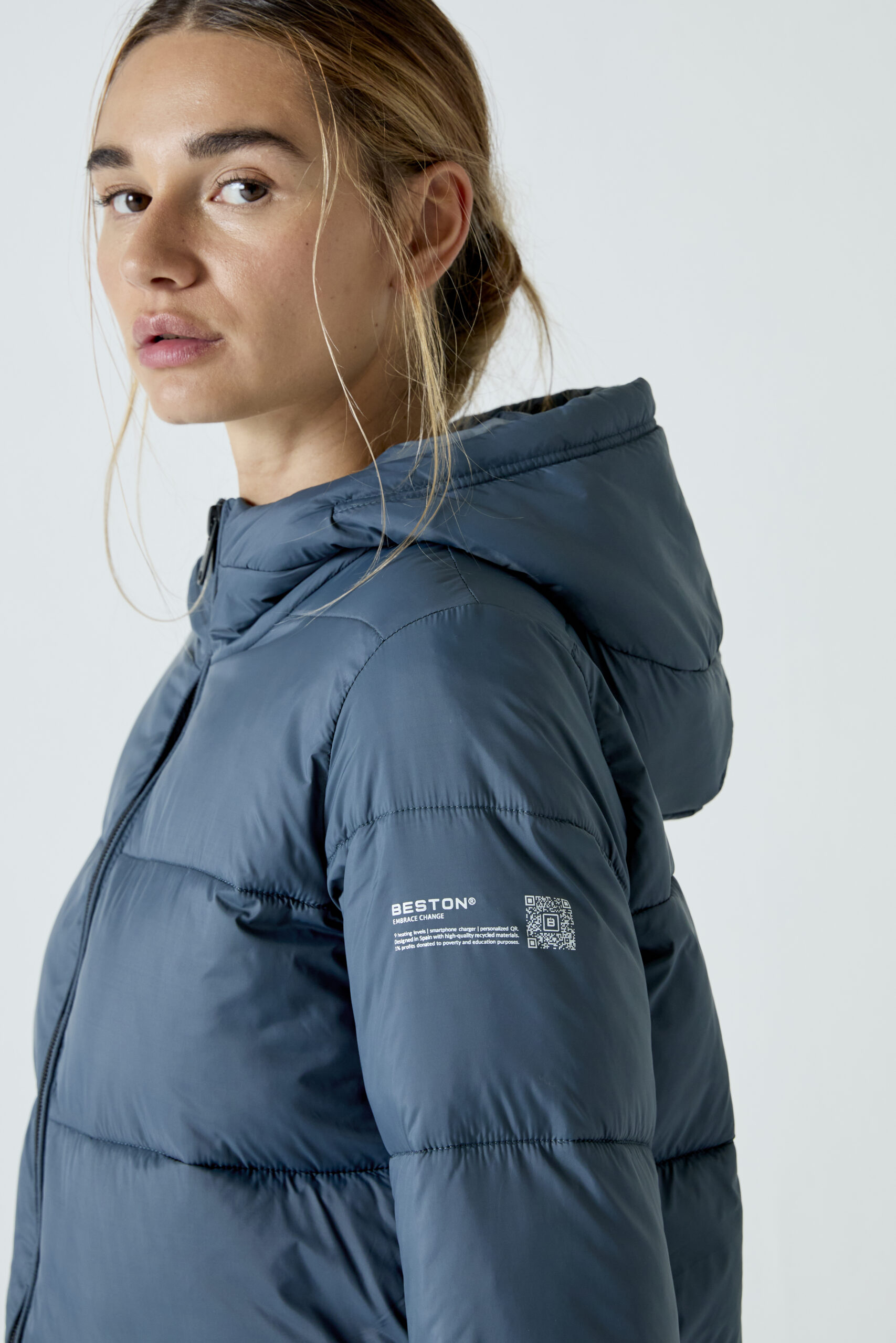 Abrigo Heat-In Technology 2.0: 9 opciones de temperatura ajustables, 5 zonas de calefacción optimizadas, con funcionalidad de carga móvil y hasta 6 horas y media de duración (bateria incluida en el envio). QR personalizado integrado: Incluye tu perfil profesional, social y de emergencia. Hecho con materiales reciclados certificados.